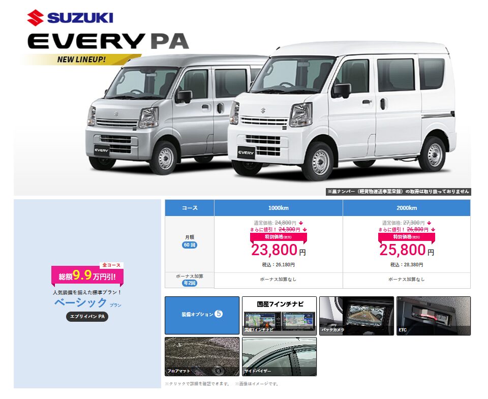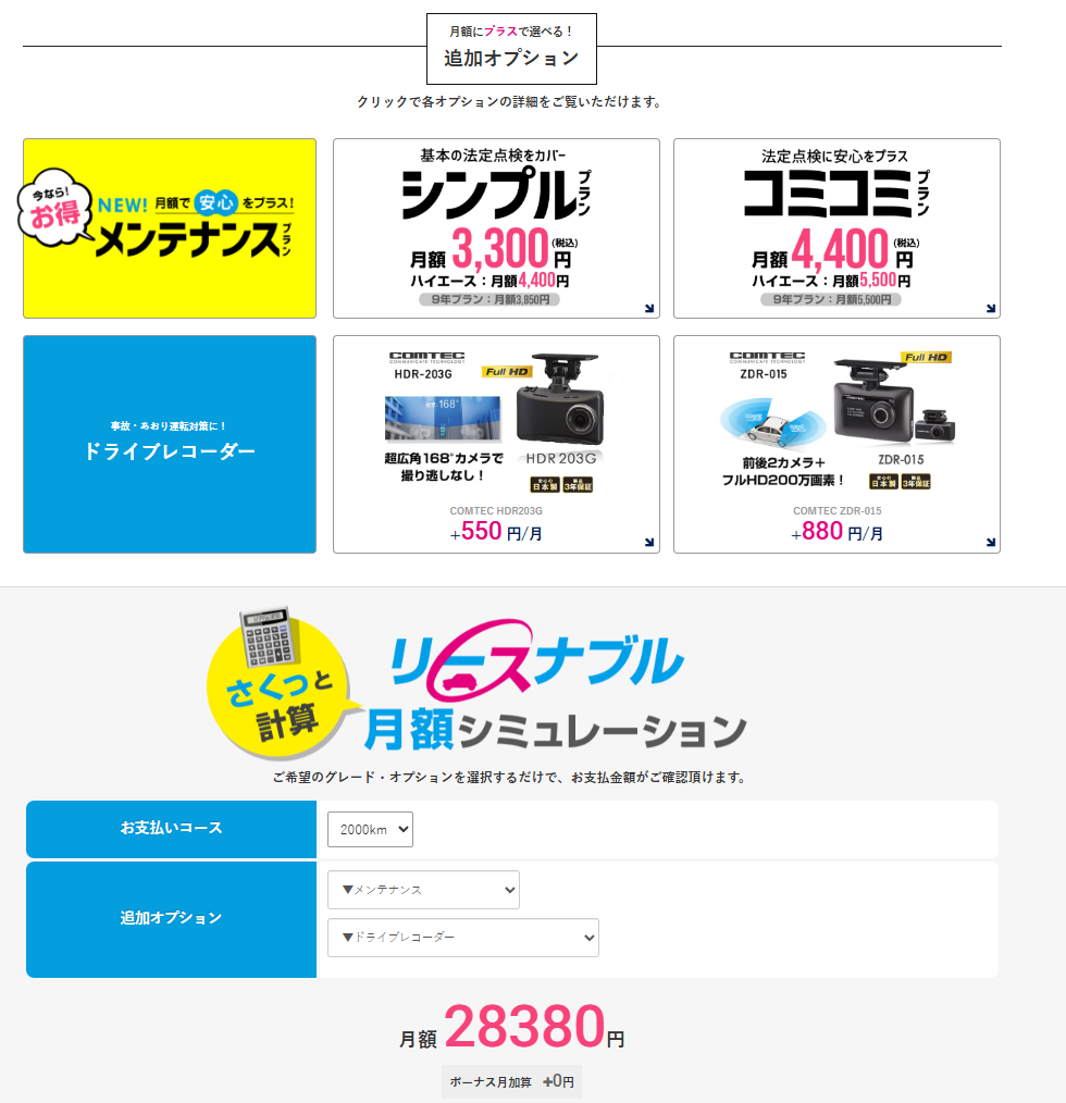 いつでも解約OK(お乗り換え・買い取りが自由とあるのでリースをやめて返却はNG?と疑問が残る)、メーカー保証付き、オプションで装備も充実なので比較的安心してお使いいただける環境。